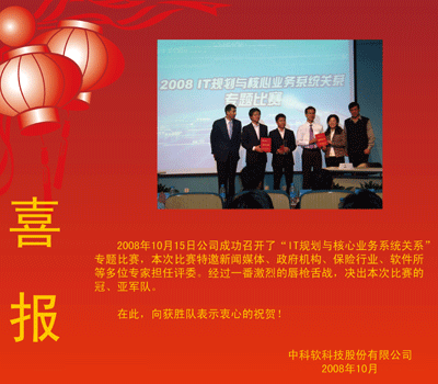 2008年10月15日公司成功召开了“IT规划与核心业务系统关系”专题比赛,本次比赛特邀新闻媒体、政府机构、保险行业、软件所等多位专家担任评委。经过一般激烈的唇枪舌战,决出本次比赛的冠、亚军队。