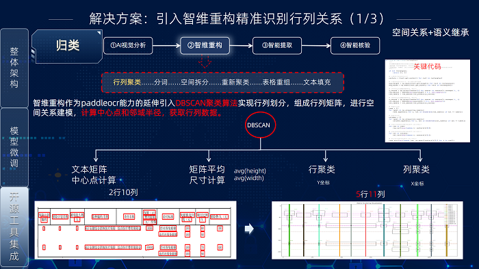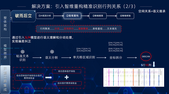 “智维重构”方案解决无边框表格识别和视觉粘连问题,其核心流程包含四步:行列聚类、粘连文本分割、表格重组和文本填充。