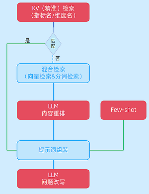 优先采用KV精准检索机制,当用户查询中的关键要素(如指标名、维度名)能够与知识库中的词根、术语完全匹配时,直接召回对应的结构化知识内容;而对于表述不够完整或模糊的查询,则启动混合检索模式,结合向量检索和分段检索等方式进行扩展召回,确保最大程度覆盖用户意图。