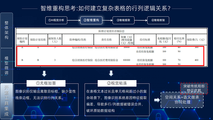 为确保平台有效落地,团队对现有开源产品进行了深入调研与对比。结果显示,国内主流开源产品中,大部分AI开源模型在通用场景表现尚可,但在保险业务领域却存在不足。具体体现在识别准确率偏低、大尺寸图像内容识别不全、复杂表格信息粘连等关键问题上。