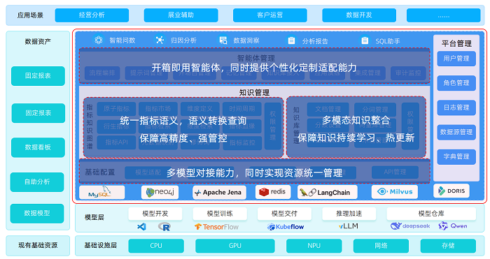 智能体管理:智能体构建平台主要包括流程编排、记忆管理、知识库接入及对外集成等功能。除提供开箱即用的数据分析智能体之外,还具备个性化定制适配能力。