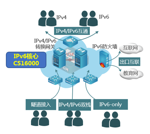 CS16000系列交换作为教育城域网的交换中心,承担各中心校网络、教育局局域办公网、数据中心的接入和转发,并顺利获得安全出口区与市城域网等外网互通。