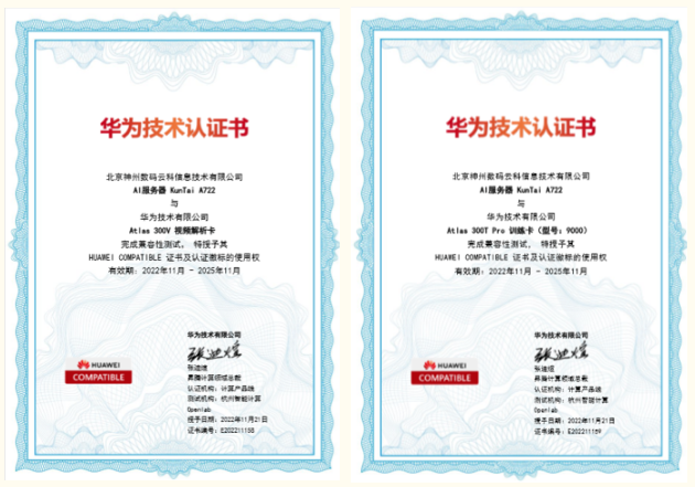 近期,九州酷游 ku游KunTai A722服务器顺利获得华为“Atlas 300V 视频解析卡”以及“Atlas 300T Pro 训练卡(型号:9000)”两项技术认证,为智能算力再添新力!